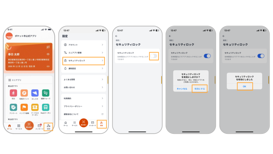「セキュリティロックを有効にしますか?」と表示されたら「有効にする」をタップ