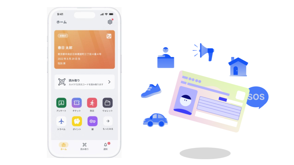 本人確認が必要なサービスを利用する際は、読み取り端末にスマートフォンをかざすか、QRコードを読み取ることで認証が完了します。