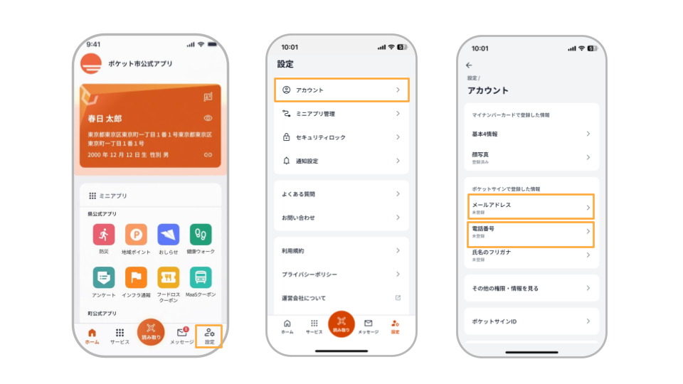 アプリに登録しているメールアドレス・電話番号の確認および変更は、以下の手順で行えます。