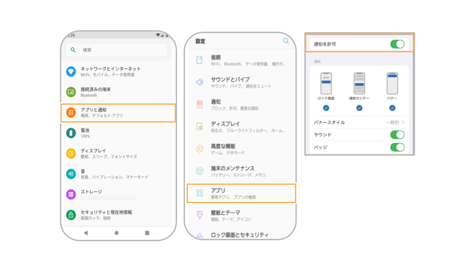 「通知の表示」や「通知を許可」がオンになっているか確認