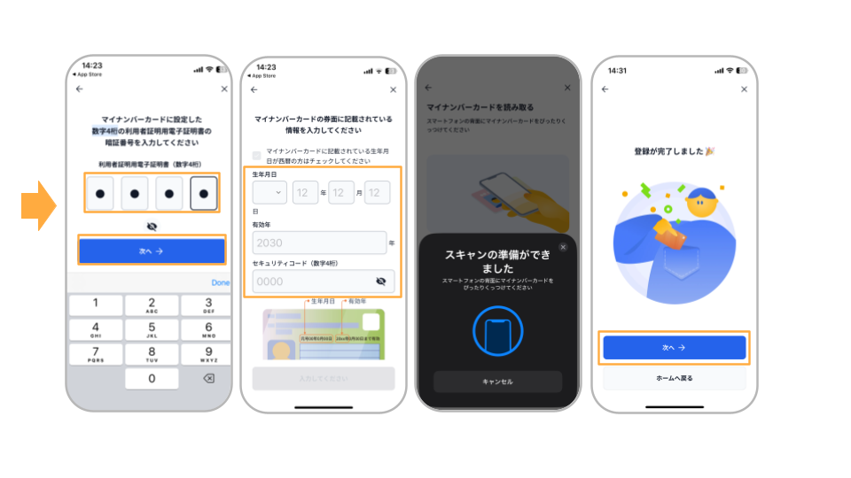 マイナンバーカードの券面に記載された情報を入力し、「次へ」を選択 ※セキュリティコードは、顔写真の下部に記載されている番号です。
